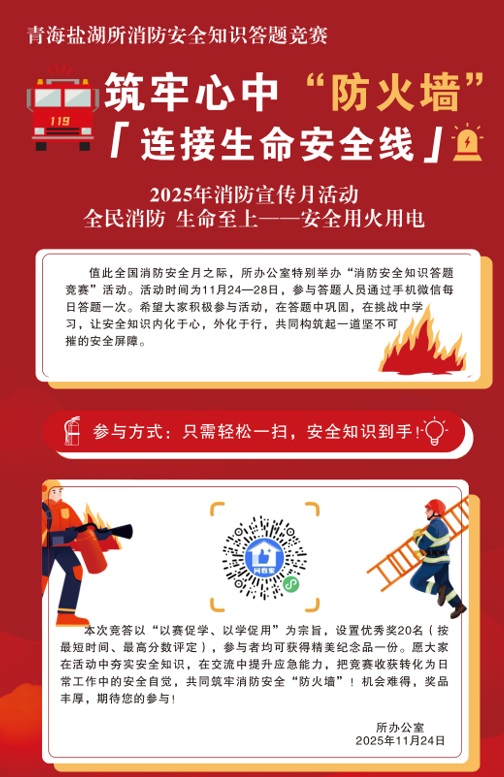 为切实筑牢消防安全防线,提升全员消防安全意识和应急处置能力,在全国消防月期间,青海盐湖所创新消防安全教育形式,于11月24日至28日组织开展了线上消防安全知识竞答活动,全所100余名职工及学生通过扫描二维码参与活动,以赛促学、以学促用,营造了浓厚的消防安全学习氛围。