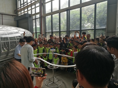 研学活动第二站是西南交通大学牵引动力国家重点实验室。同学们跟随指导老师参观实验室的机车、大型机械以及中国第一条载人高温超导磁悬浮试验线,观摩了360度自由磁悬浮模型试验。通过与老师互动,了解了磁悬浮列车的悬浮原理和相关技术,同学们分组乘坐了高温超导磁悬浮小车。