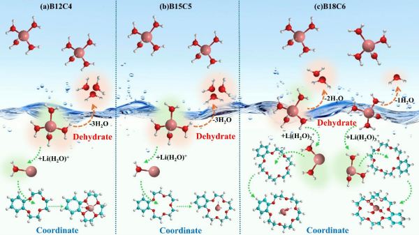 针对冠醚-离子液体分离锂同位素体系,团队发现水分在有机相中分别与稀释剂、协萃剂、冠醚、锂离子等多种组分结合,其中冠醚弱相互作用和锂离子配位为水分进入有机相的主要机制;冠醚自身可以捕获一定的水分,且冠醚孔腔尺寸越大,捕获水分能力越强,通过调控冠醚,实现有机相中水含量的有效控制;三种冠醚体系有机相中锂离子团簇的组分分别为B12C4-Li+-H2O、B15C5-Li+-H2O和B18C6-Li+- 2H2O;对于B12C4和B15C5,络合物上水分子多直接与锂离子配位;对于B18C6,水分子可与锂离子、冠醚同时发生作用。