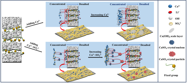 针对电渗析中的离子交换膜污染展开了系统的研究,特别是卤水中的Ca2+引起阳离子交换膜(CEM)上的无机结垢,深入研究了不同共存阴离子的Ca2+溶液与CEM的相互作用与污染过程、结垢机理的关联机制。该研究通过监测污染过程中淡室电导率、pH以及浓室溶液性质变化趋势,设计Ca2+吸附实验,结合DFT结合能模拟计算,深入解析污染过程中离子传质差异,膜的结构特征及表面电化学特性。研究表明Ca2+与CEM的相互作用的差异性是影响污染过程中的传质行为以及无机结垢的根本,研究成果为开发有效的Ca2+结垢污染控制策略提供理论支持。(J. Membrane. Sci., 713 (2025) 123283)