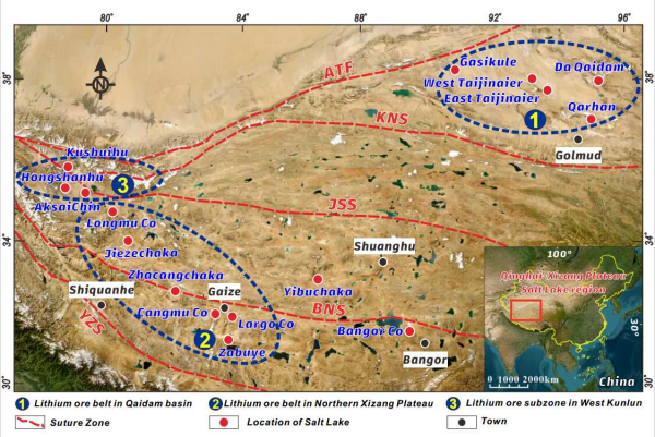 (4)青藏高原北部自西昆仑向东至巴颜喀拉山,发育了一条宽广的硬岩锂矿成矿带带。而在该成矿带上或其两侧,形成了柴达木盆地、可可西里盆地以及西昆仑山间盆地等诸多富锂盐湖,但这一硬岩锂矿带与其毗邻地区发育的富锂盐湖之间的关系尚不清楚,是青藏高原盐湖地球科学领域需要解决的难题之一。