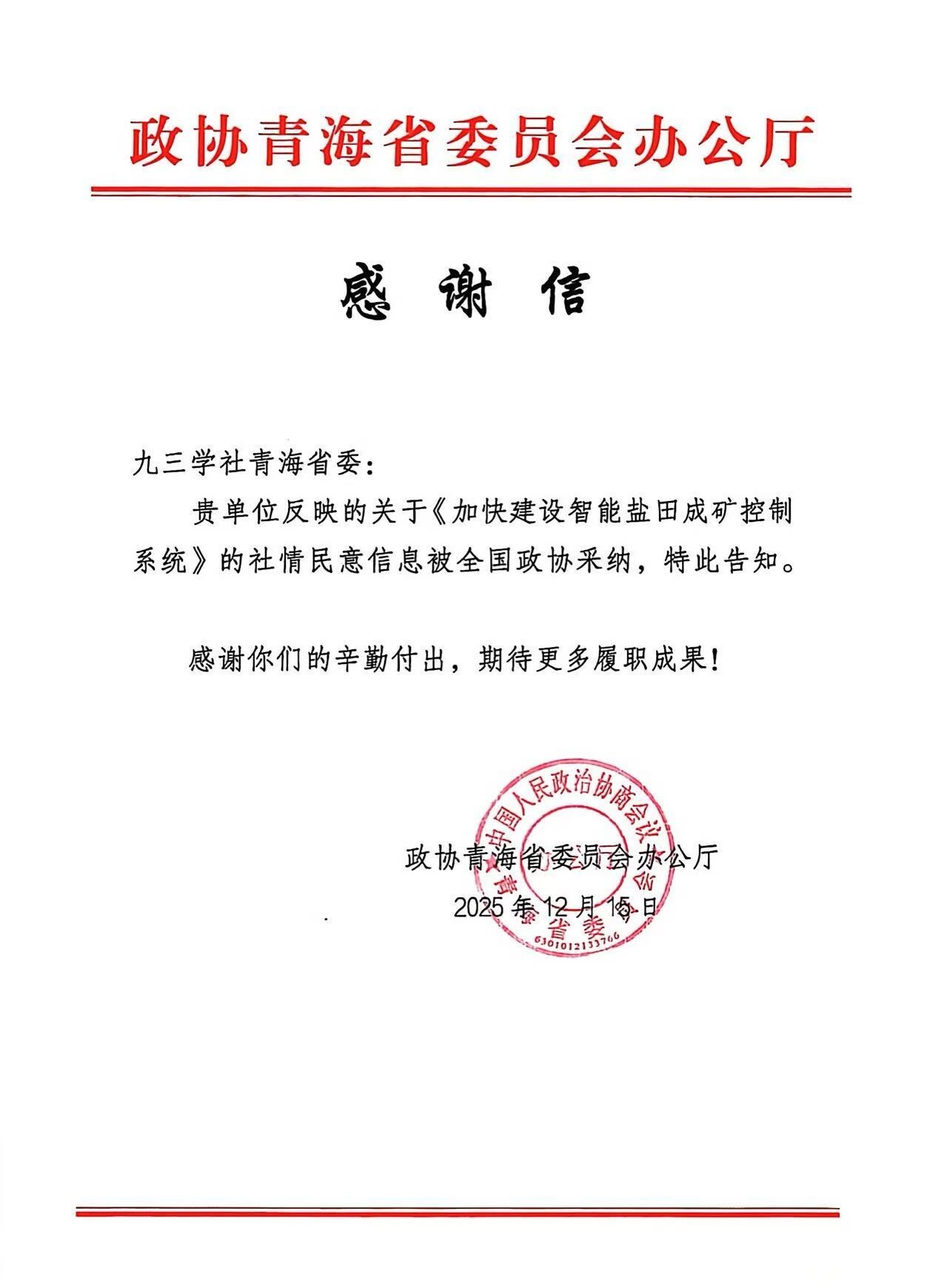 近日,从政协青海省委员会办公厅获悉,九三学社中国科学院青海盐湖研究所委员会社员张永明撰写的社情民意信息《加快建设智能盐田成矿控制系统》,已被全国政协采纳。